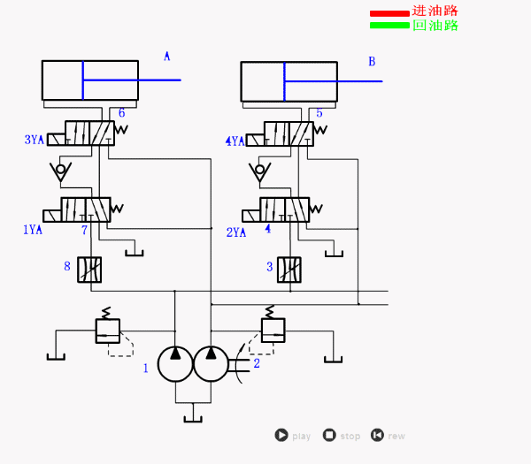 雷同于换向回1,可能特指采用分歧中位机能的换向阀(如O型、H型)的节制回。分歧中位机能影响换向时系统的保压、卸荷或施行元件浮动等形态。