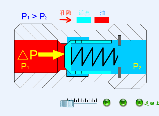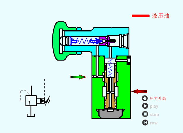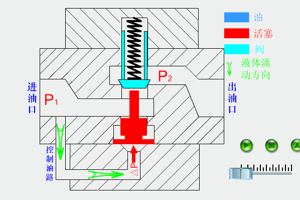 曲动溢流阀操纵阀芯底部的液压感化力间接取弹簧力均衡来节制压力。当进口压力跨越弹簧设定值时,阀芯抬起,油液溢流回油箱,从而系统最高压力。其布局简单、响应快,但压力波动较大,凡是用于低压或小流量场所,或做为先导阀利用。