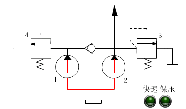 由一大一小两泵构成,低压时双泵合流供油,实现快速活动;高压时,大泵通过卸荷阀卸荷,小泵零丁供油实现工进。该回能按照负载从动切换,节能结果好。
