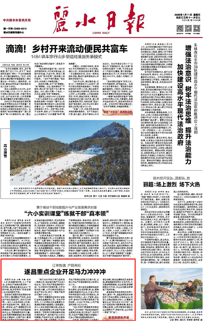 1月11日,《丽水日报》头版刊文:《订单丰满 产销两旺丨遂昌沉点企业开脚马力冲冲冲》,原文如下。